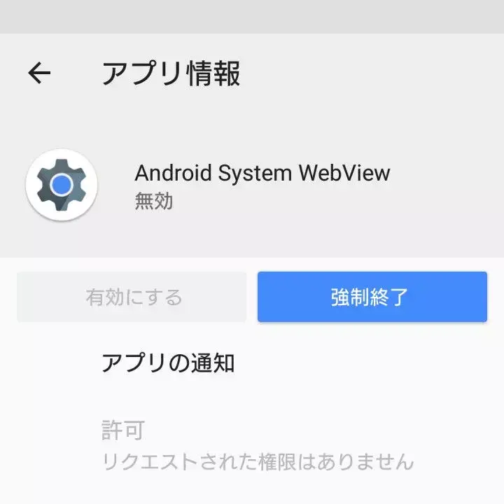 - Android System WebViewの情報ページで、「有効にする」または「無効にする」ボタンをタップします。