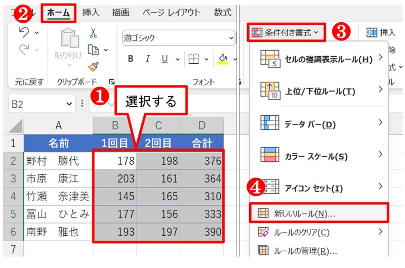 - 条件付き書式の開始: [ホーム] タブから [条件付き書式] をクリックし、[新しいルール] を選択します。