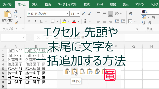 エクセルで複数のセルの後ろに同じ文字を一括で追加する方法はありますか?
